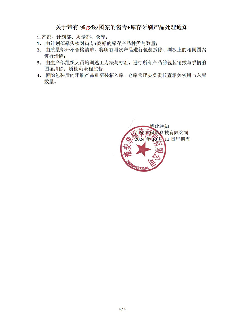关于带有chgate图案的齿专+库存牙刷产品处理通知